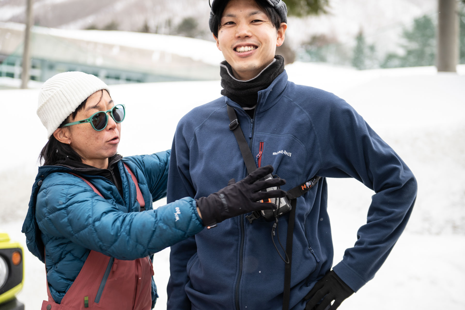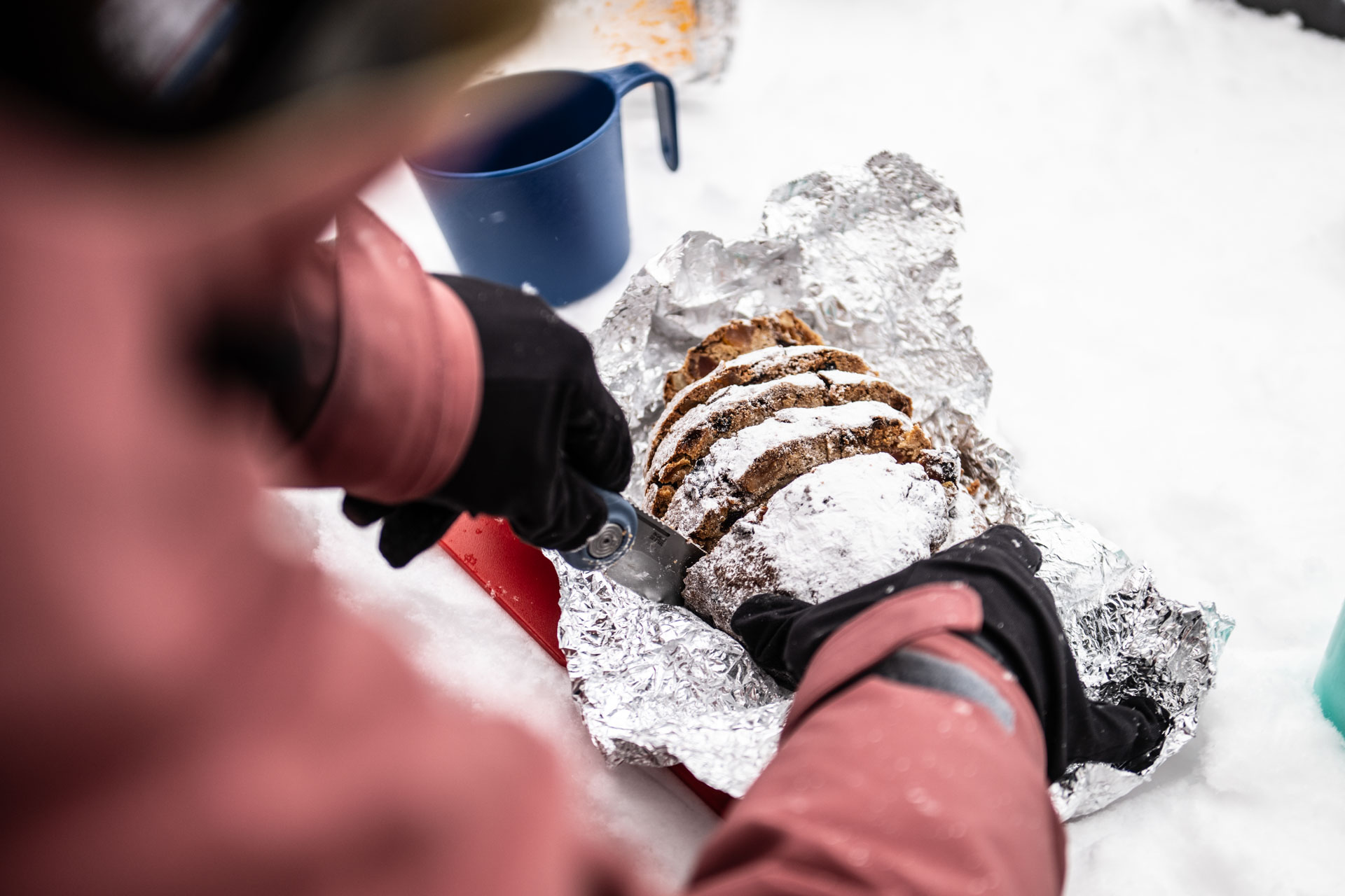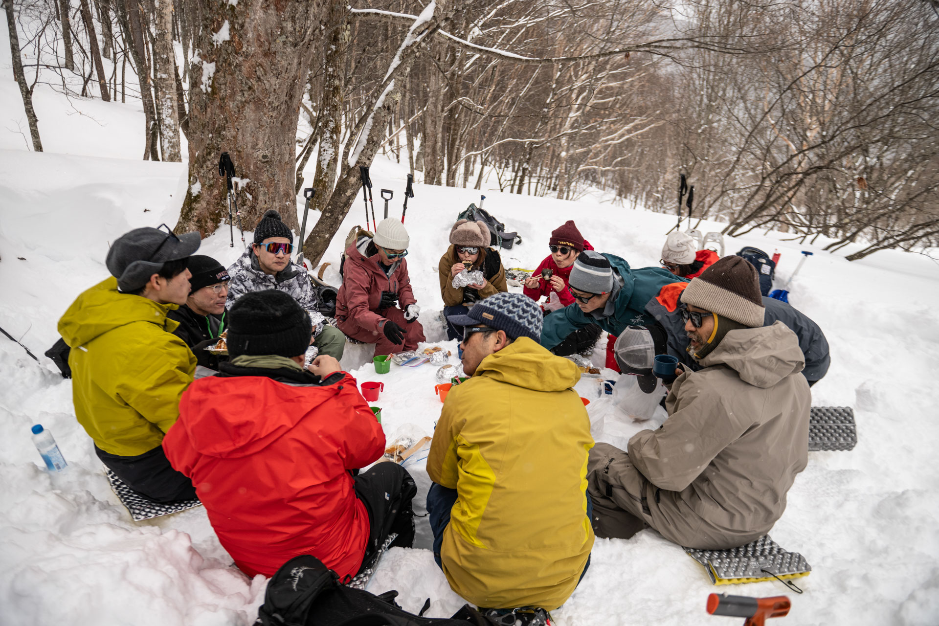 ランチボックスは、地元レストランのシェフが地元の食材を使用して毎朝作ってくれている。自分たちで作った雪のテーブルを囲んでいただくランチに舌鼓しながら、みんな自然と笑顔が溢れ、会話が弾む。MSRのストーブでおいしいお茶も入れていただき、デザートとともに、フルコースでランチタイムを満喫した。はじめて顔を合わせるメンバーがほとんどだったが、こうして山時間を共有することで、だんだんと互いの距離も縮んでいく。山のマジックはいつだってすばらしい。