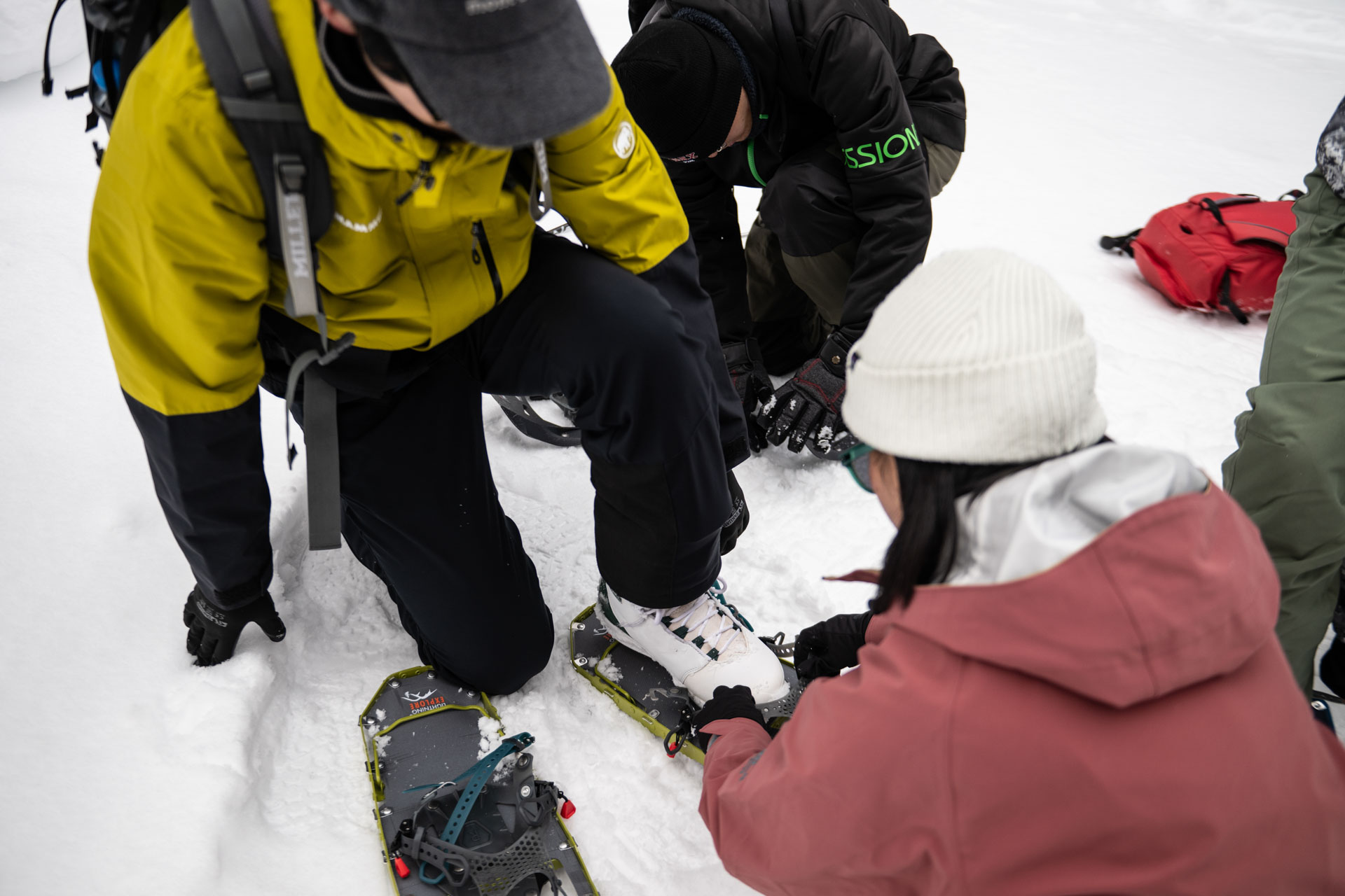 今回のMSRとのコラボツアーに参加された皆さんは、雪山ハイキングが初体験な方、しばらく離れていたバックカントリーライディングを再開するきっかけとして参加された方、景色を眺めながら雪山をのんびり楽しみたい方など三者三様。多様なメンバー構成であっても、スノーシューハイキングなら、みんなで雪山を楽しむことができる。
