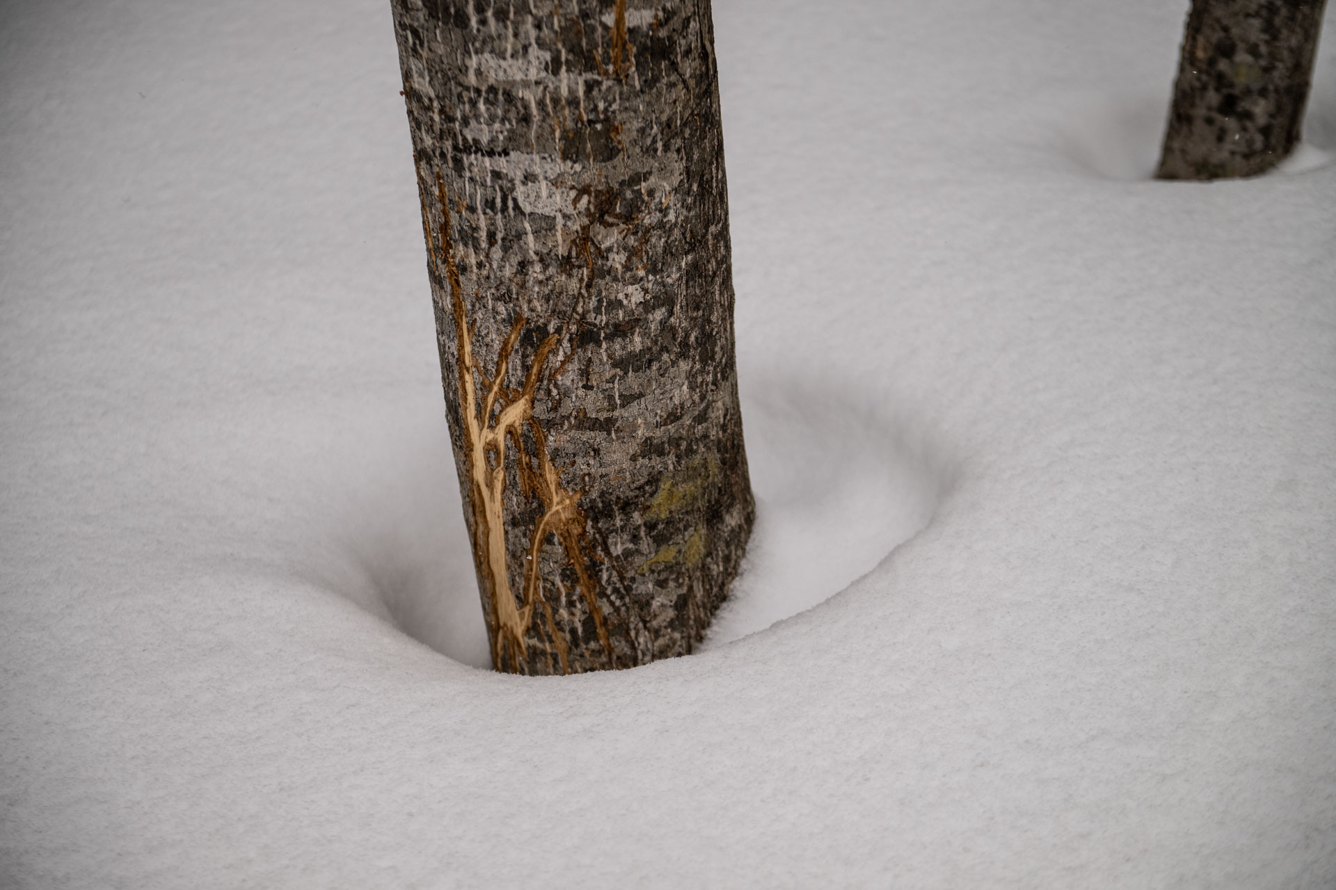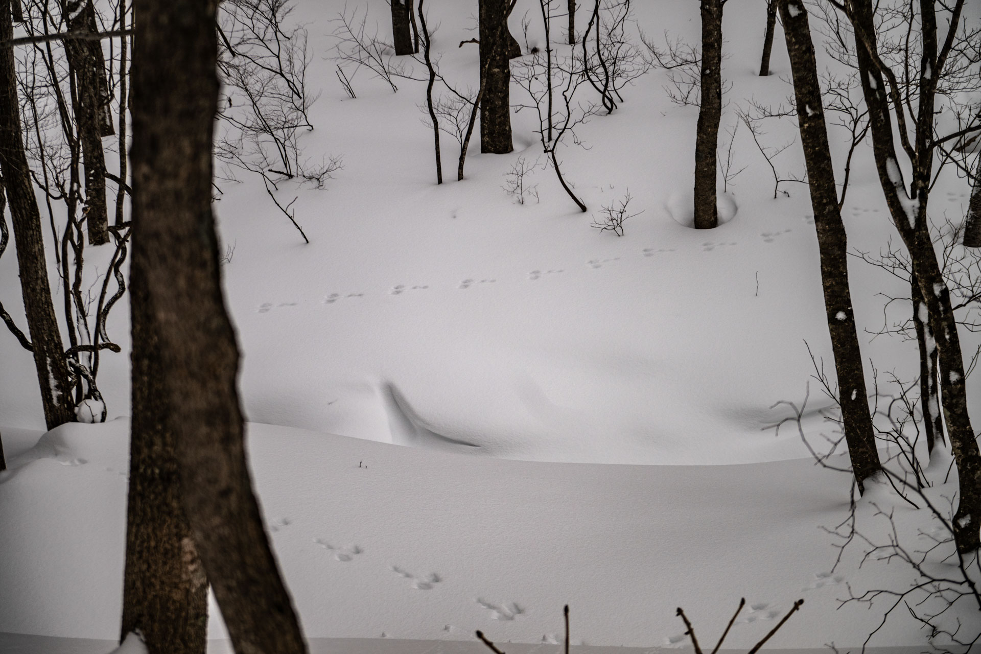 雪の森を歩いていると、雪面についた無数の動物たちの足跡をみかける。森で暮らすノウサギやニホンカモシカ、キツネやリスたちのものだ。この日はノウサギの足跡をあちこちで発見した。どっちに向かって移動したのか、走っていたのか歩いていたのか、巣はどこにあるか、食事をしていたのかなど、足跡からさまざまな想像を働かせることができる。