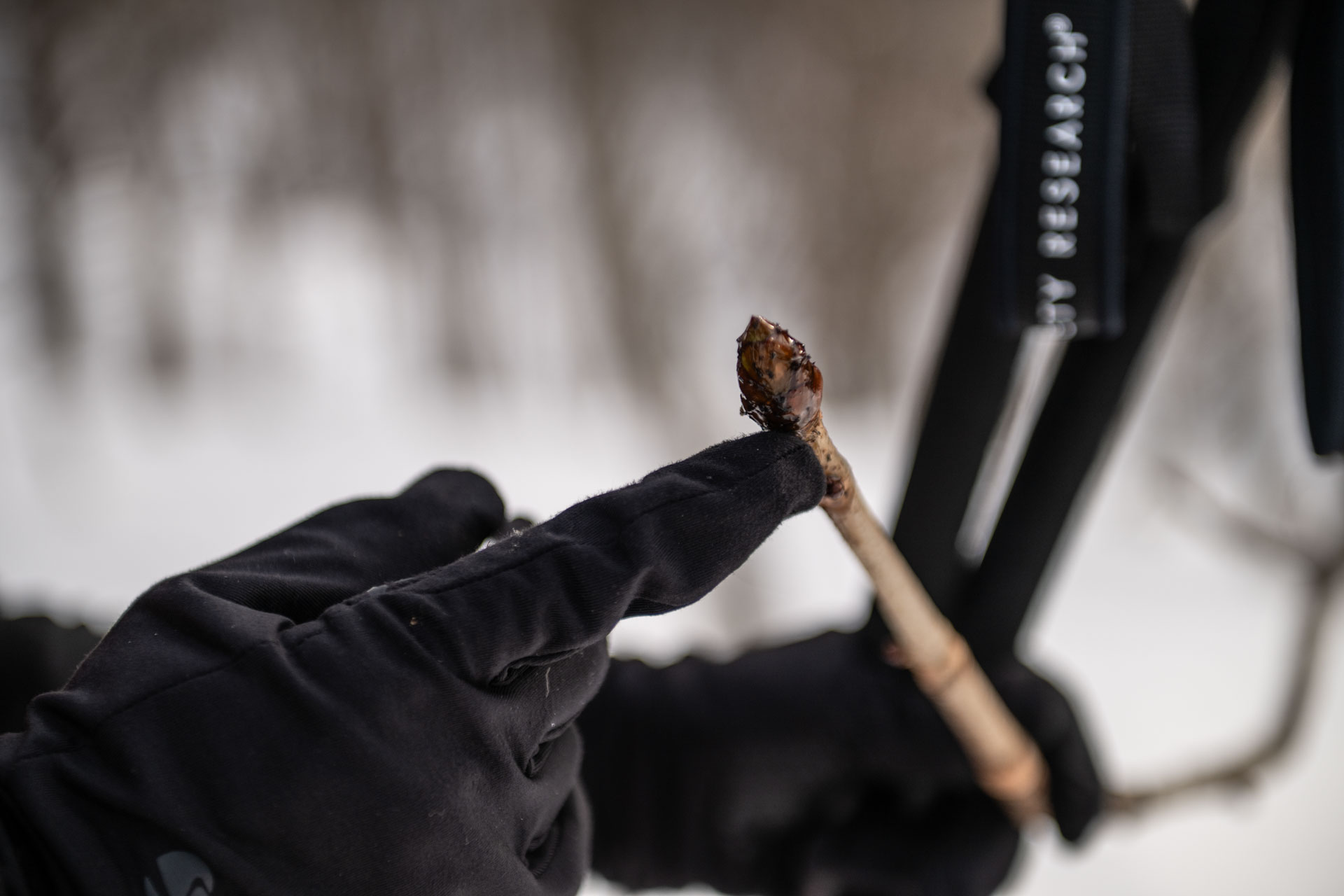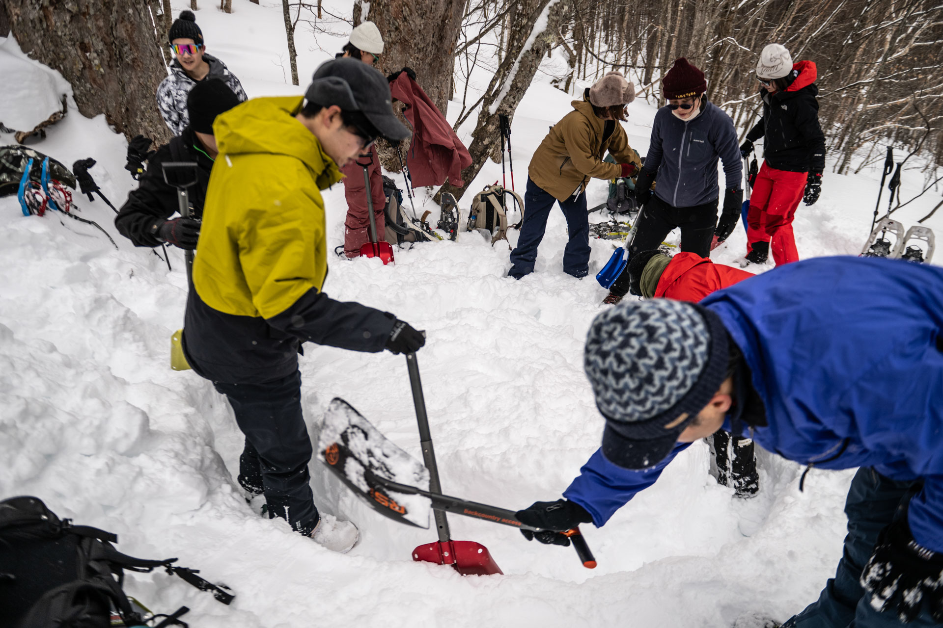 足跡のほか、樹木の冬芽の観察や食痕、秋に熊が食事をした跡(熊棚)など、動物たちの森での暮らしを垣間みることができる。私たちのすぐ側の雪山で暮らす生き物たち。静かな森から聞こえてくる彼らの息遣いを感じながら、山におじゃまさせてもらっている謙虚な気持ちを忘れずにいたい。