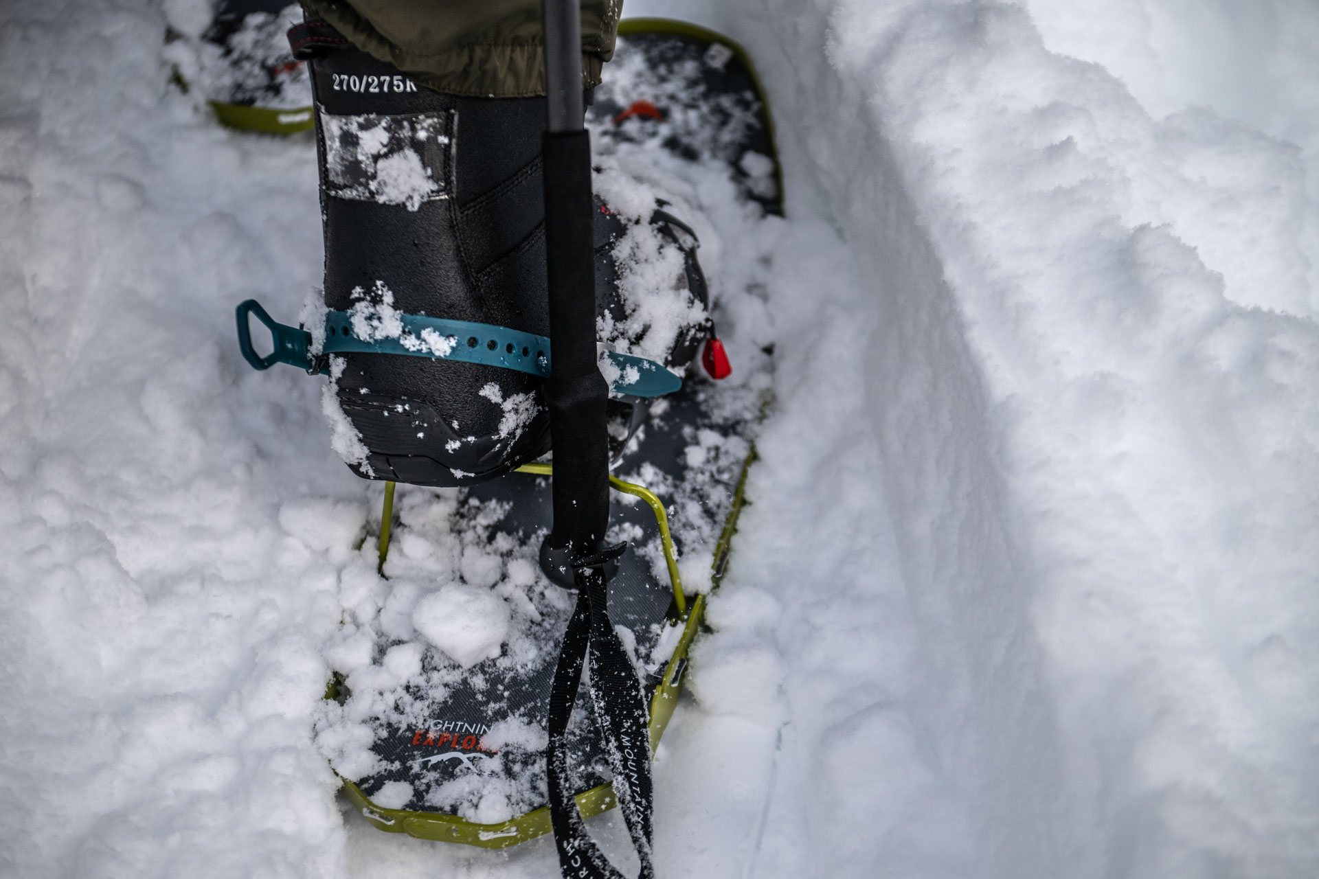 森の入り口で準備を整えていざ出発。深く積もった雪をスノーシューで踏み締めながら、森の奥地へと歩を進めていく。冬の間、多くの樹木や植物は雪に覆われるため、森の見通しは夏よりも各段に良くなる。光が注ぐ真っ白な森の様相や遠くに見える稜線など、見るものすべてが美しい。