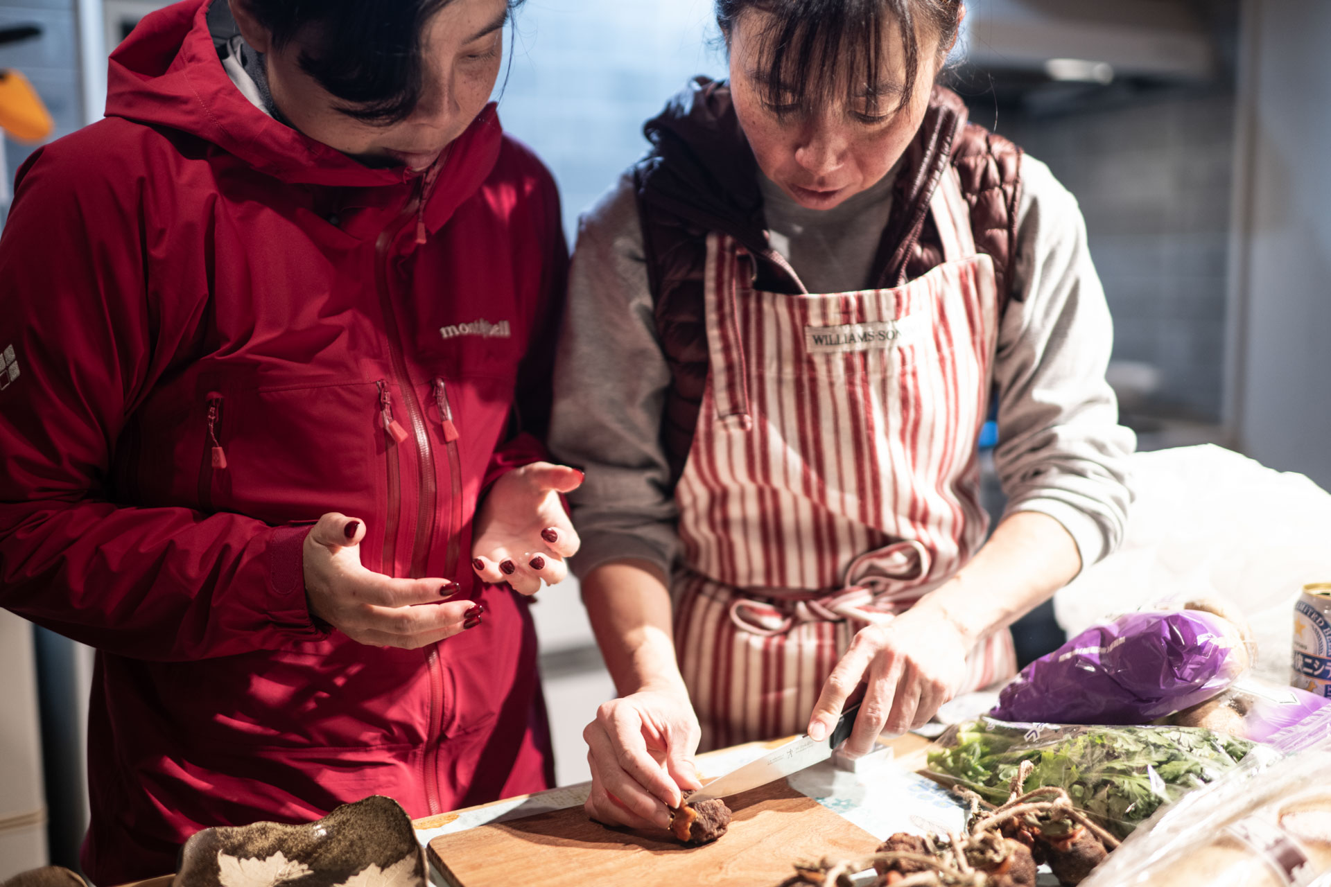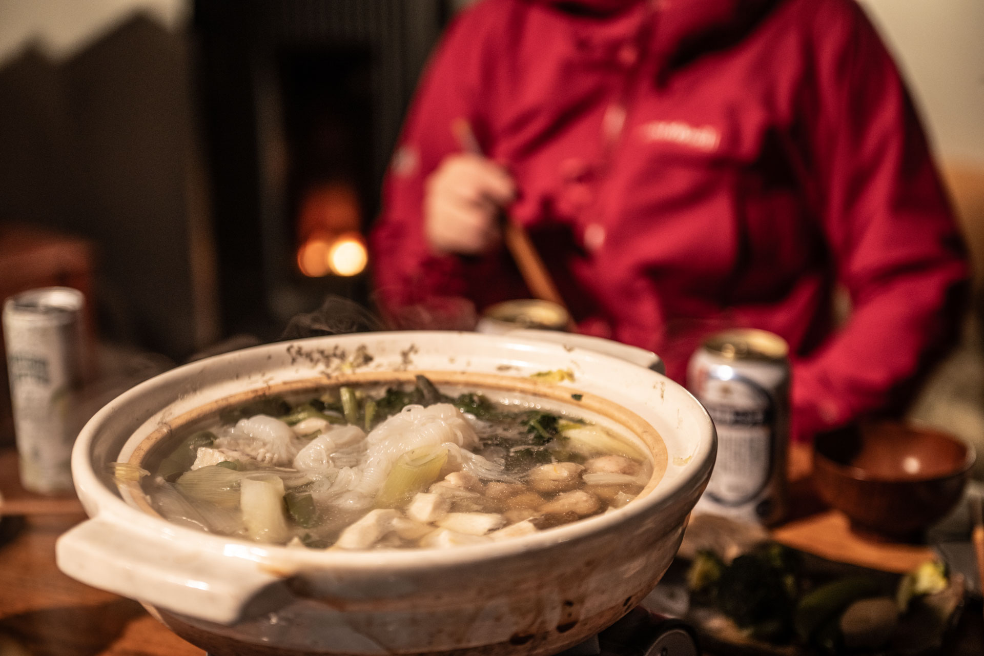 小屋は、80年ほど前の古い納屋を3年ほどかけてリノベーションした。古材がふんだんに使われていることもあり居心地が良いと好評だ。冬はペレットストーブに火を灯し、夏は小屋に隣接する広大な畑でつくっている野菜を使って料理をしている。常連さんの中には、小屋の夕食会も楽しみに来てくださる方も少なくない。山とセットでぜひ一度訪れていただきたい。