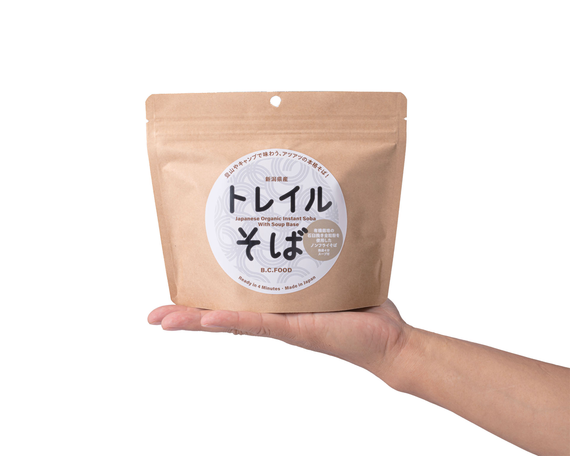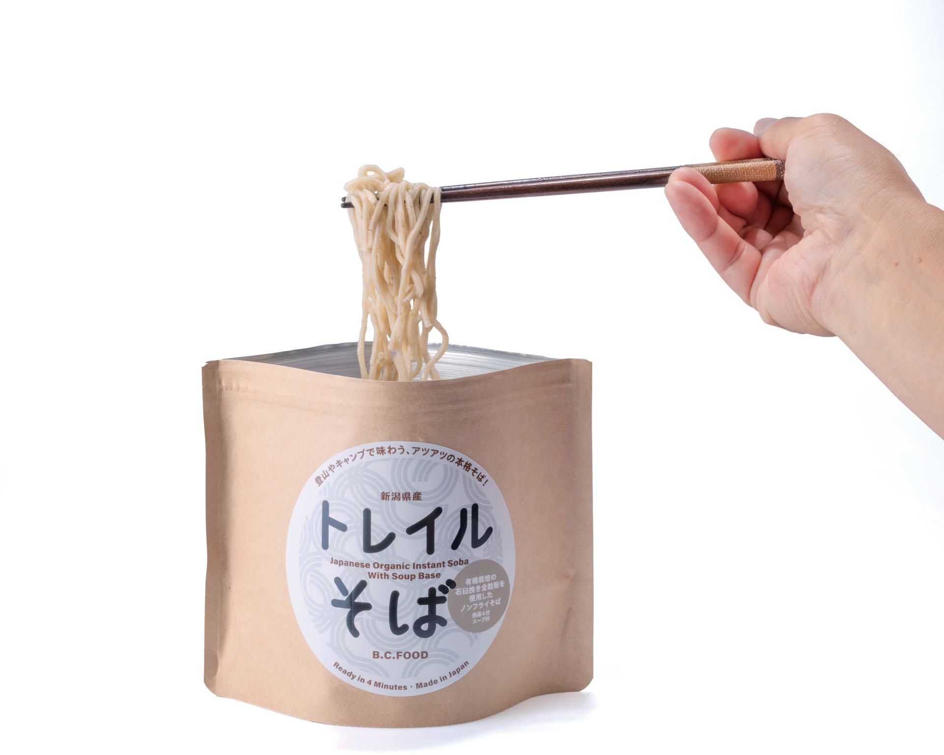 袋に直接湯を注ぎ、4分待つだけで、アツアツの本格的そばが楽しめる。アウトドア用ドライフーズを見回しても、ありそうでなかったこの即席そばは、冷凍と冷風乾燥を用いたノンフライ製法により、そば粉を高配合した本来の香り豊かな味わいと、生麺のようなもっちりとした食感を楽しめる。小千谷の農園にて完全無農薬で育てられ、丹念に石臼で挽いた全粒粉を使用。油で揚げていないぶんカロリーも控えめ。