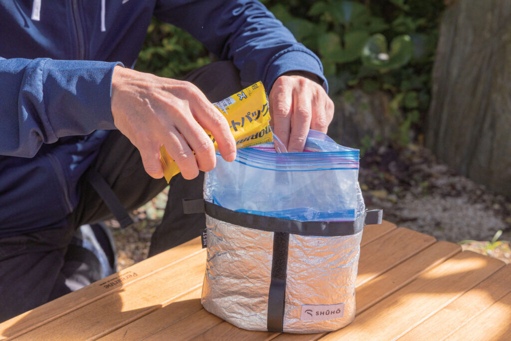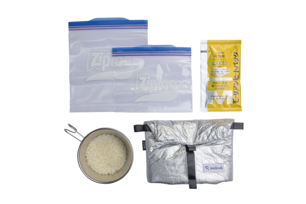 SHŪHŌレギュラーサイズに収まる中サイズの密閉袋の底に発熱剤を敷き、その上に浸水したお米を密閉袋ごとセットする。次の手順でかなり熱くなるため、密閉袋は耐熱温度の高いジップロックやポリ袋を使うこと