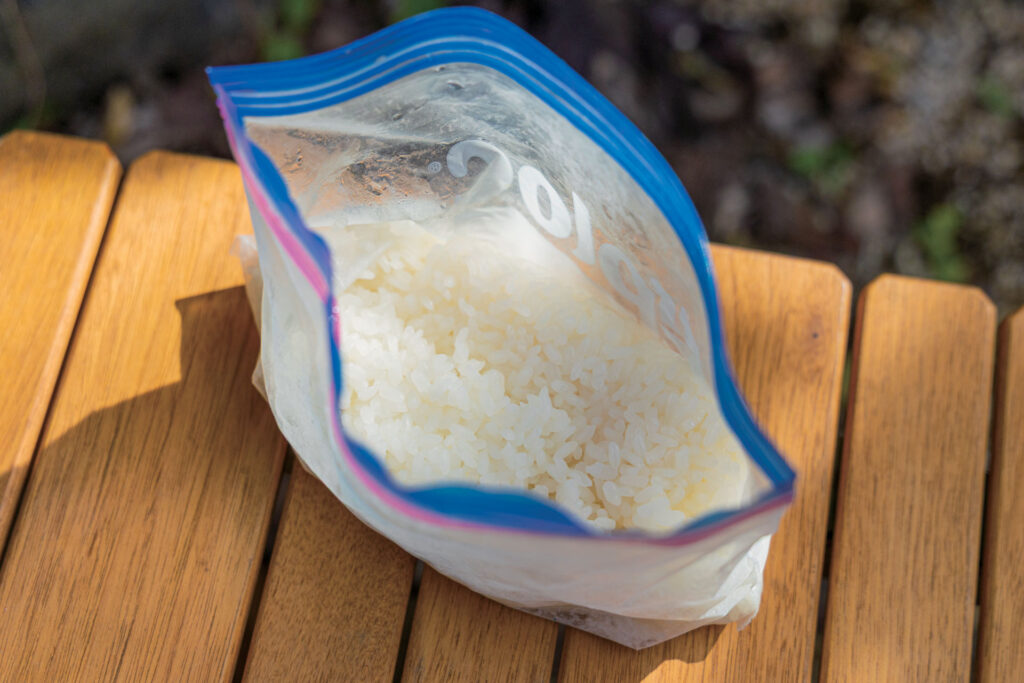 小サイズの密閉袋に米と水210mlを入れ、15分ほど浸水しておく
