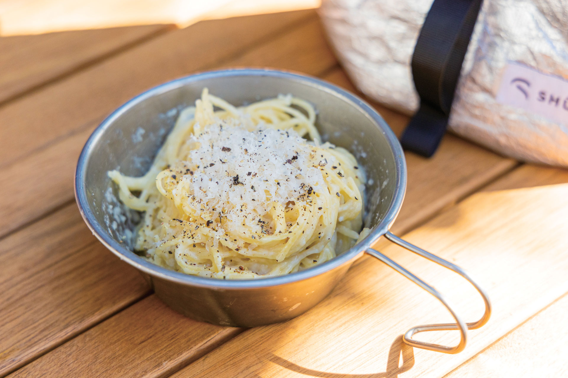 この方法はパスタにも応用が可能です。密閉袋でパスタをちょうど浸かるくらいの水に1時間半ほど浸しておき(パスタが長い場合は半分に折る)、ご飯と同様に発熱剤とSHŪHŌで加熱するだけ。密閉袋にソースを入れれば、器を使わず食べることも可能です。