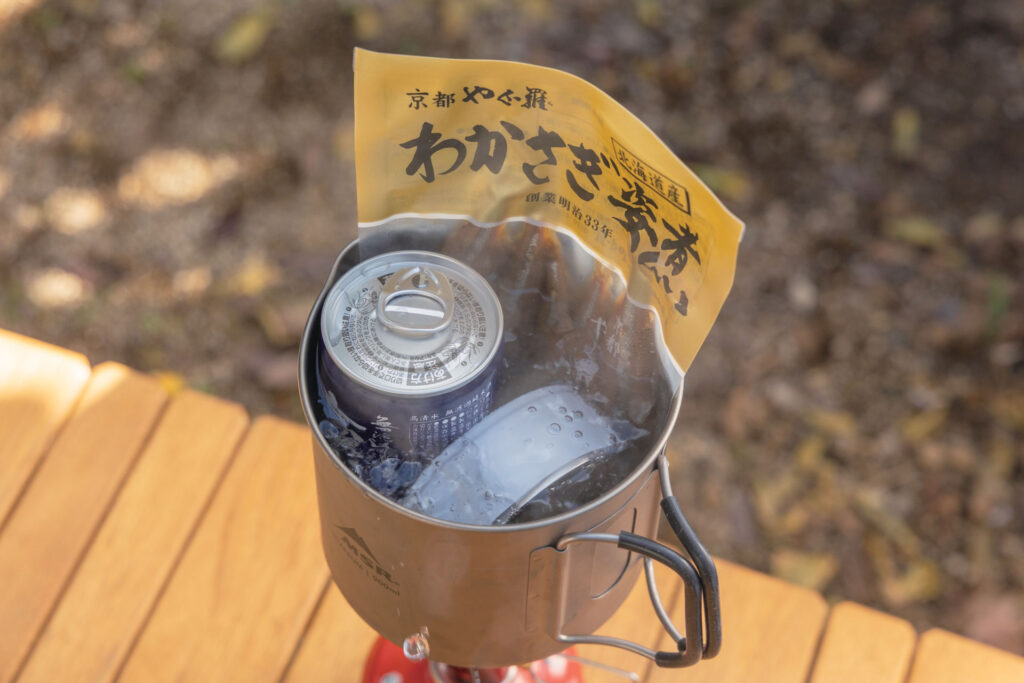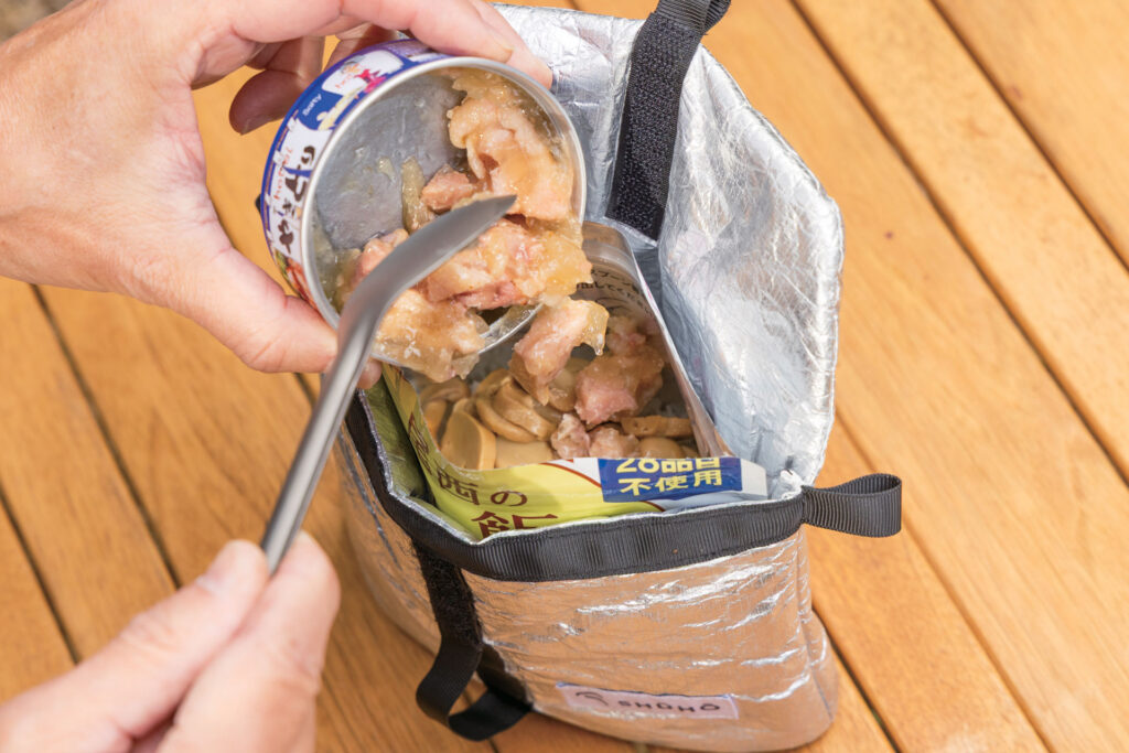 保温力の高いSHŪHŌに湯煎したおつまみや日本酒缶を入れておけば、