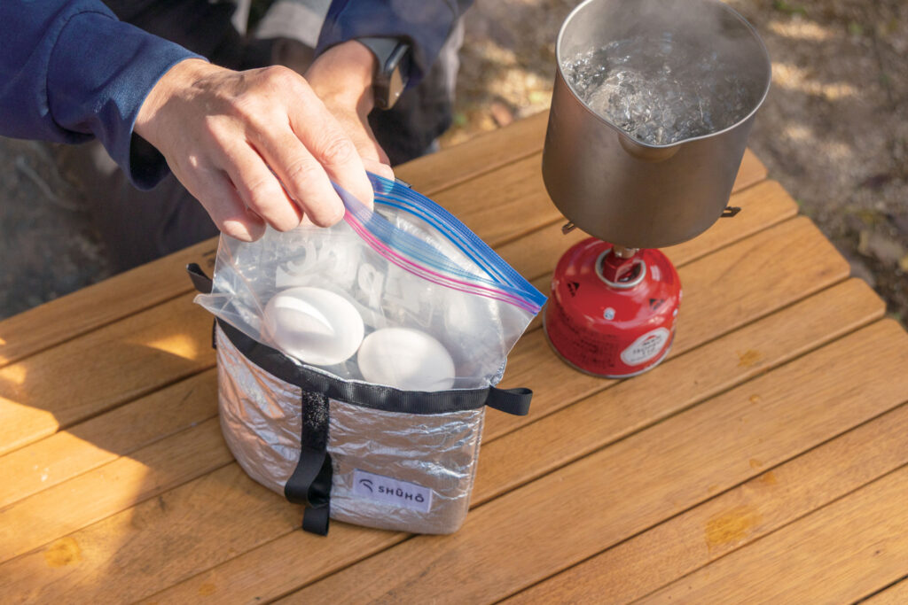 ジップロック等の密閉袋に常温の卵と熱湯を入れ、フードネストにセットして待つだけ。