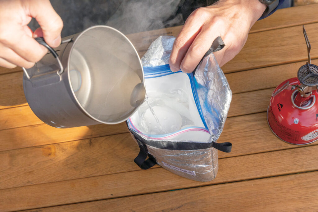 卵が入った密封袋にお湯をそそぎ、口をしっかりと閉じる。