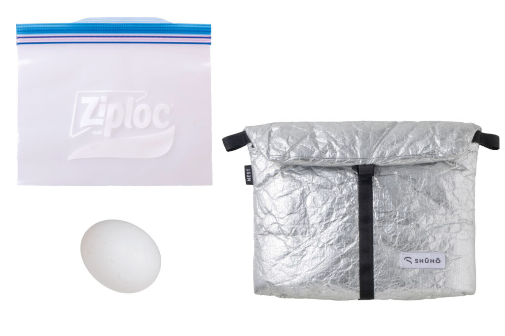 SHŪHŌレギュラーサイズに収まる中サイズの密閉袋に卵を入れフードネストにセットする。