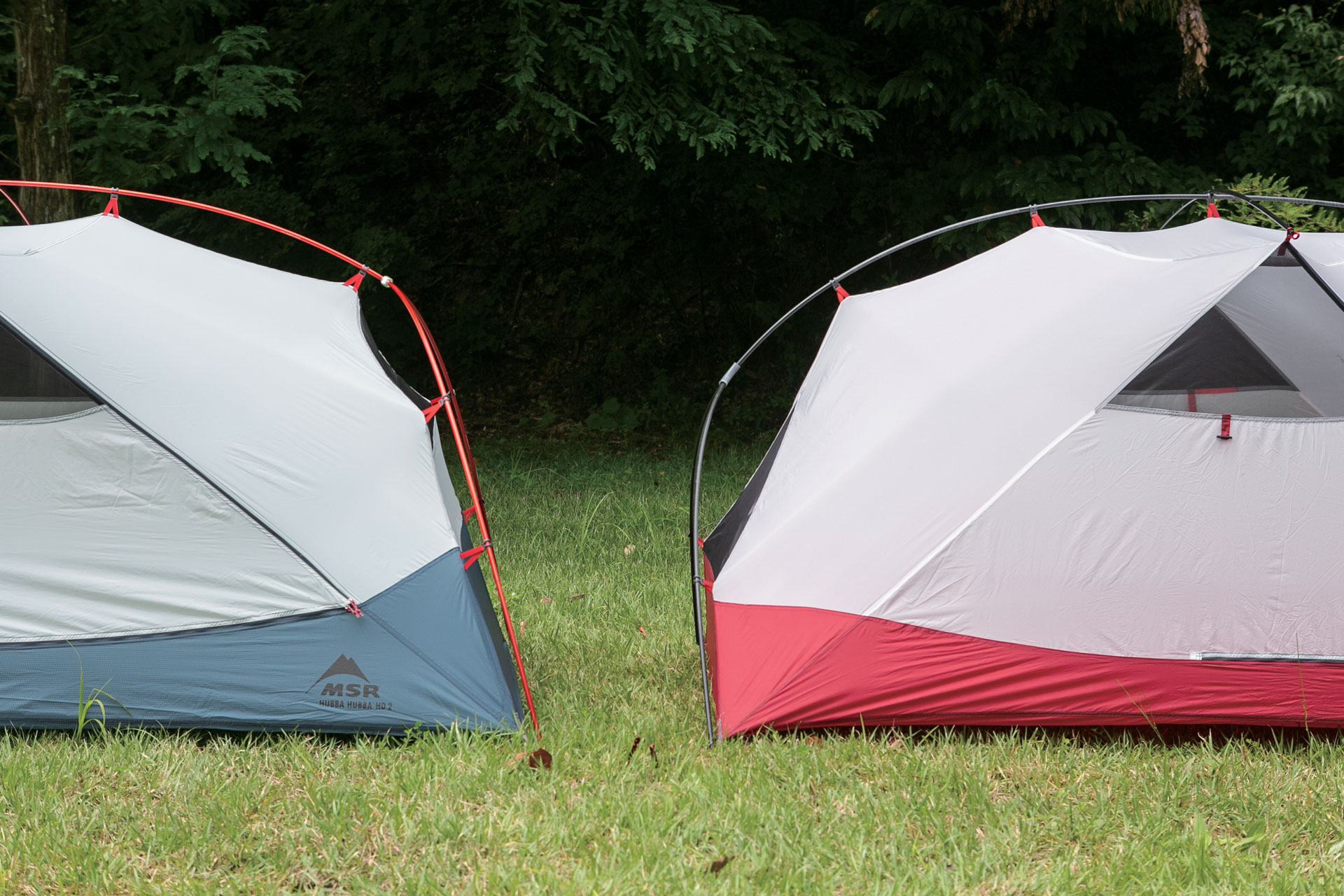 写真左のハバハバHDは側面が高い位置まで立ち上がり、より良好な室内空間とヘッドクリアランスが保たれている。耐風性についても、複合素材でできたテントポールを用いるハバハバ・シールドと同等の性能を確保する。