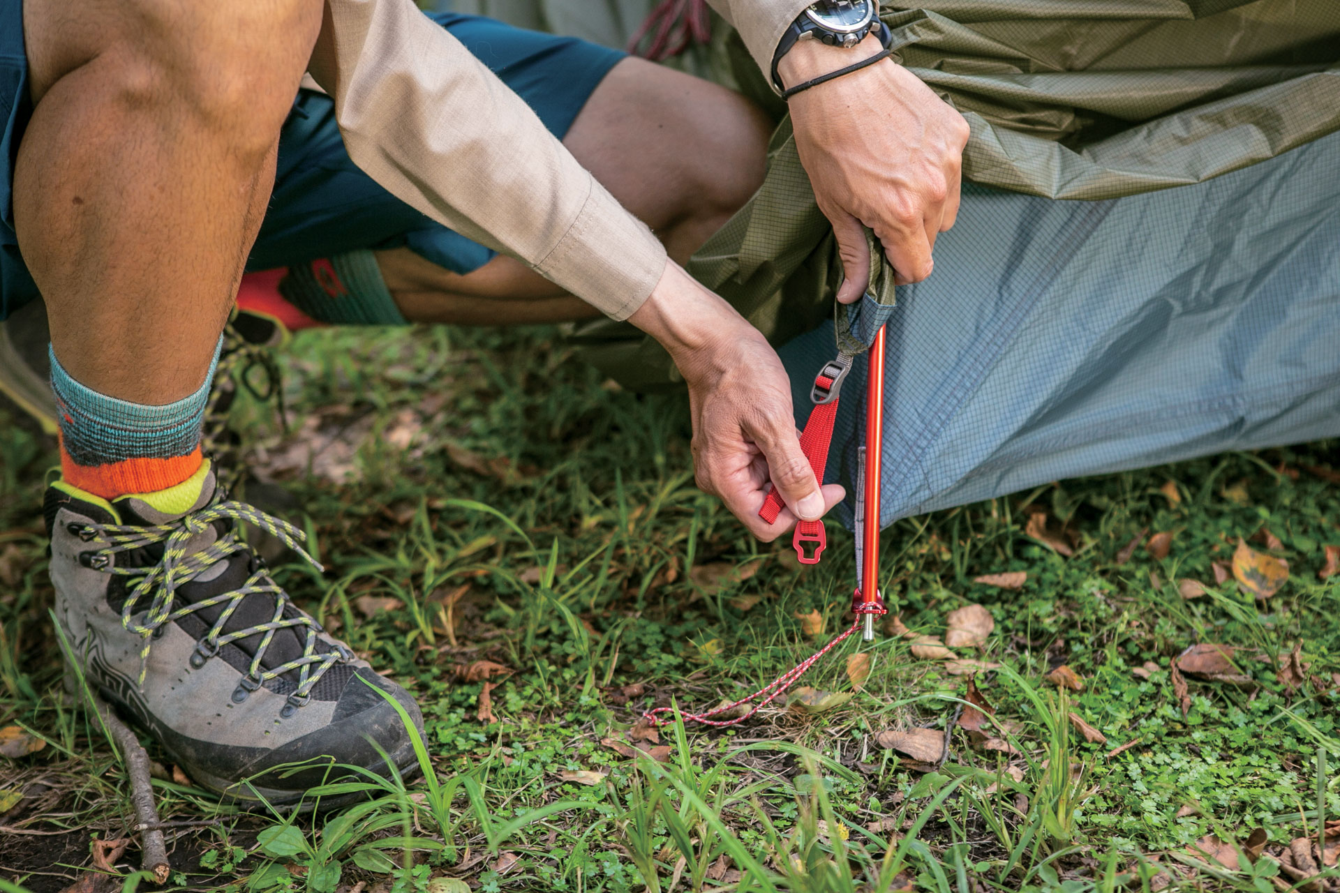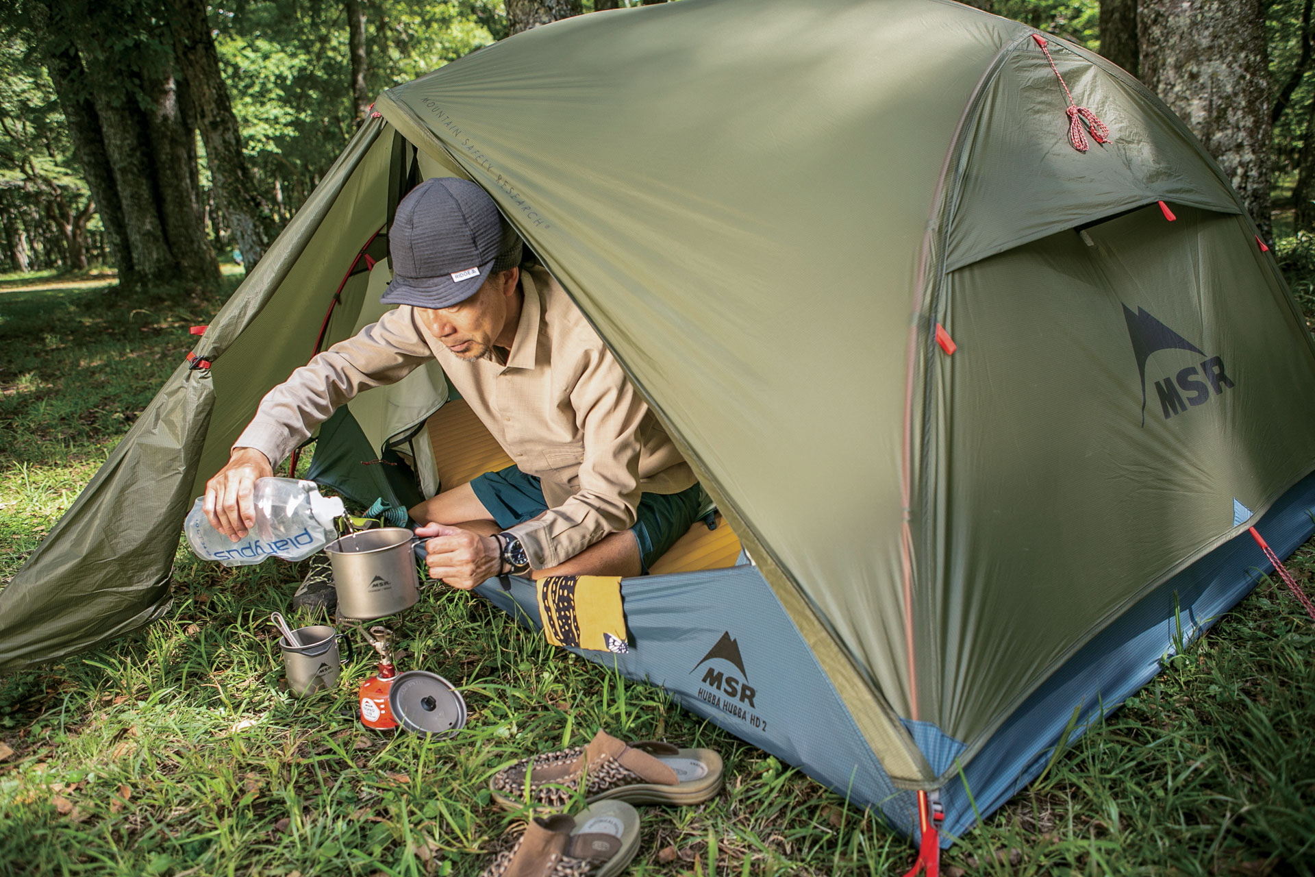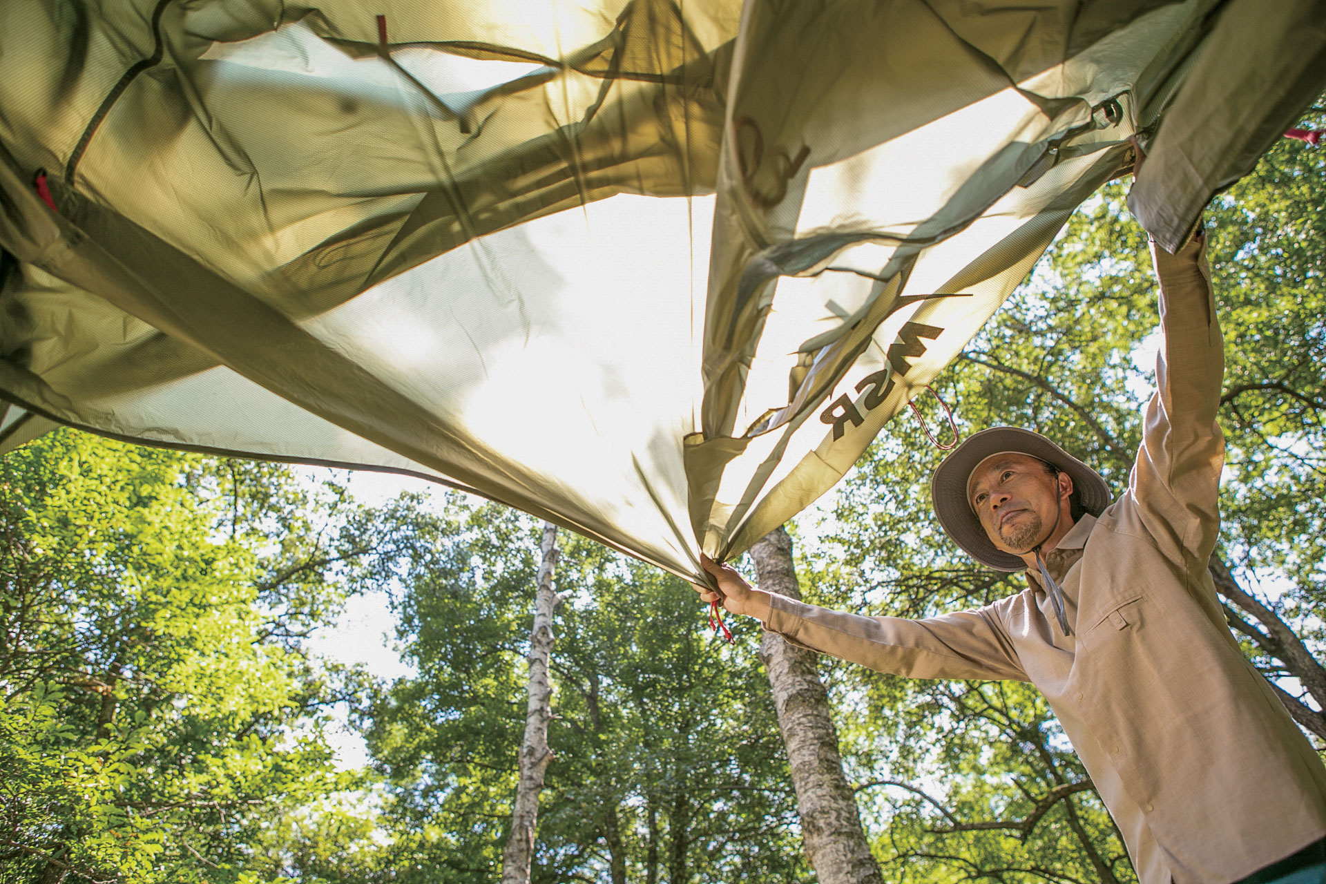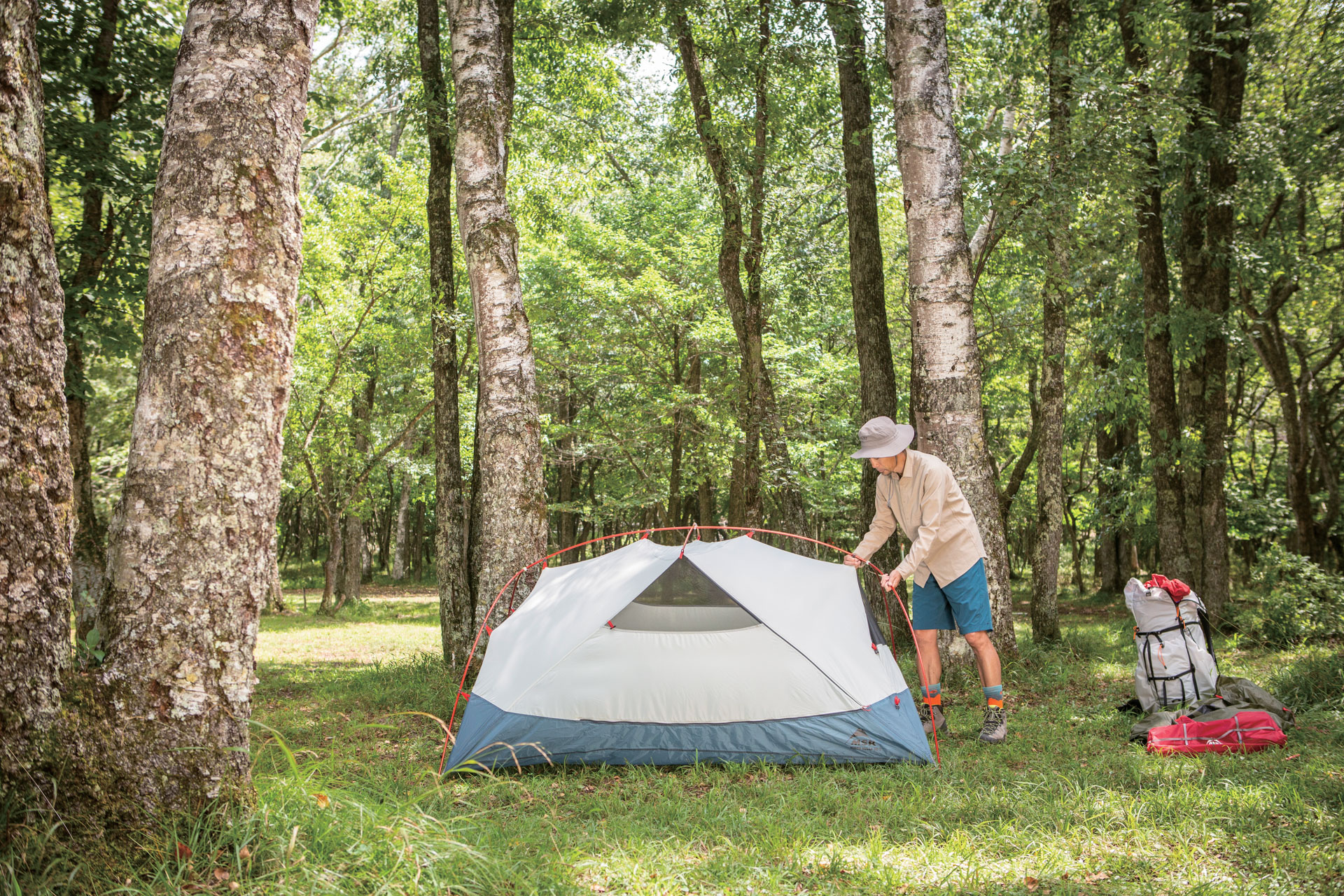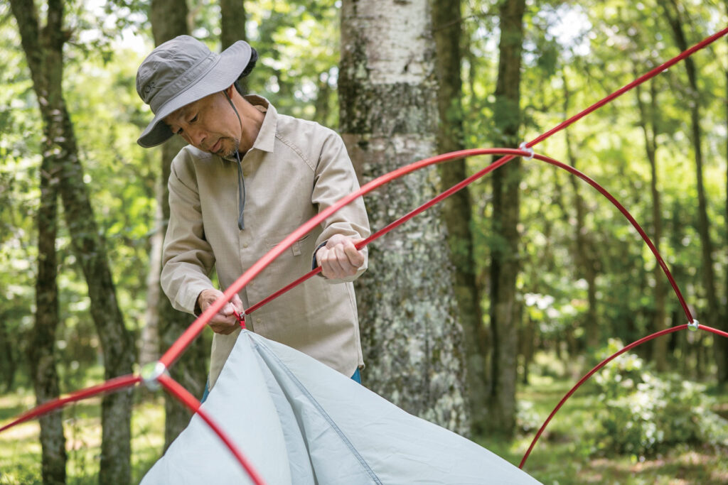 今春、MSRから登場した「ハバハバHD」は、こうした願望をかなえる理想的な3シーズンテントである。心地よさそうな木陰を見つけてテント本体を広げ、四隅をペグダウンすると真っ赤なテントポールをカチャカチャと組み立てていく。右手で本体のクリップを持ち上げて、左手に持ったポールに吊り下げていくと生地にテンションが掛かって立ち上がっていく。