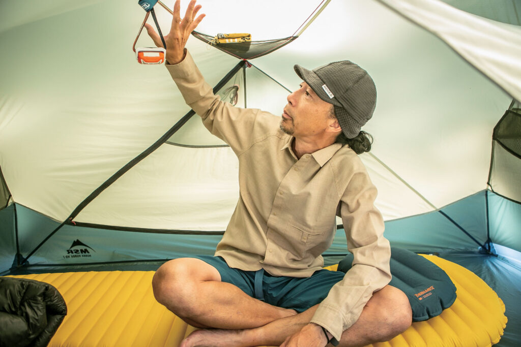最後はレインフライを被せて、状況に応じたガイラインを張れば設営完了である。バックパックから寝袋やマットレスを取り出して、テント室内へと放り込む。このときに気がつくのが、従来モデルに比べて広くなった出入り口の使いやすさと開放感である。わずかな改良点と感じるかもしれないけれど、一日に何度も出入りしたり、荷物を取り出したりしていると生地が背中や肩にあたる軽い不快感、とくに降雨時に雨が飛び散るストレスが軽減されることがわかる。